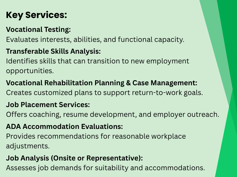 Erin M. Welsh, MA, CRC, provides comprehensive vocational consulting and rehabilitation services for individuals, employers, and legal professionals. With over 20 years of experience, she helps clients understand employability, assess earning potential, plan return-to-work strategies, and navigate complex vocational questions in a variety of case types — including personal injury, family law, employment disputes, and more.